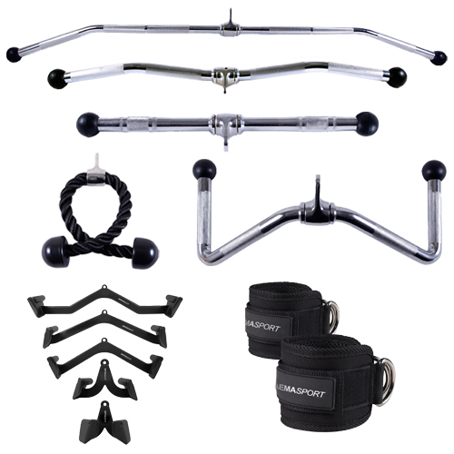 ManeralesBíceps-Tríceps, Correa tobillo/muñeca (par), Cuerda tríceps, Cuerda tríceps una, Dorsal completa, Dorsal curvado, Dorsal goma, Dorsal goma 120cm., Dorsal sencilla, Dorsal sencilla 120cm., Dorsal Z, Estribo, Estribo goma, Estribo sencillo, Lat pull, Polea baja-alta, Polea baja-alta sencilla, Recto bíceps, Recto bíceps goma, Recto paralelas, Recto paralelas corta, Recto paralelas curva, Recto paralelas curva corta, Remo polea, Set 5 agarres, Soporte 10 manerales, Tríceps curvo, Tríceps en V, Tríceps V
